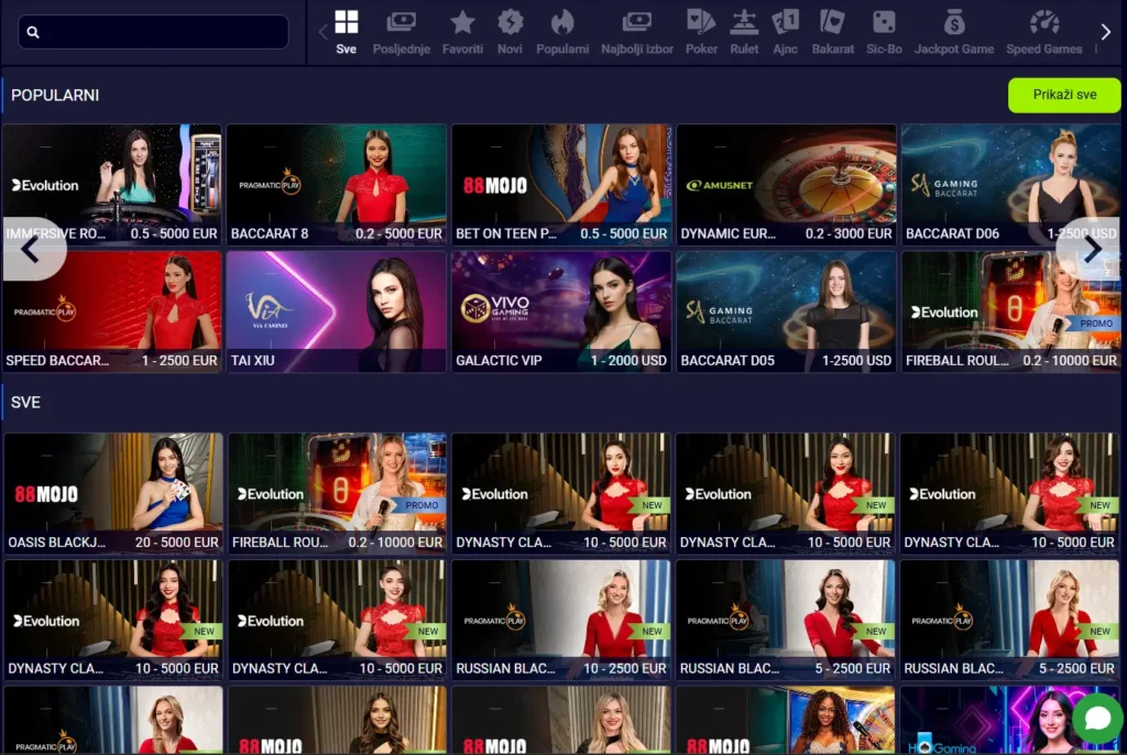 Prije ulaska za stol, igrači mogu vidjeti minimalne i maksimalne uloge, što olakšava upravljanje budžetom tokom igranja. Među popularnim live naslovima nalazi se i poznata igra Dream Catcher od Evolution studija.