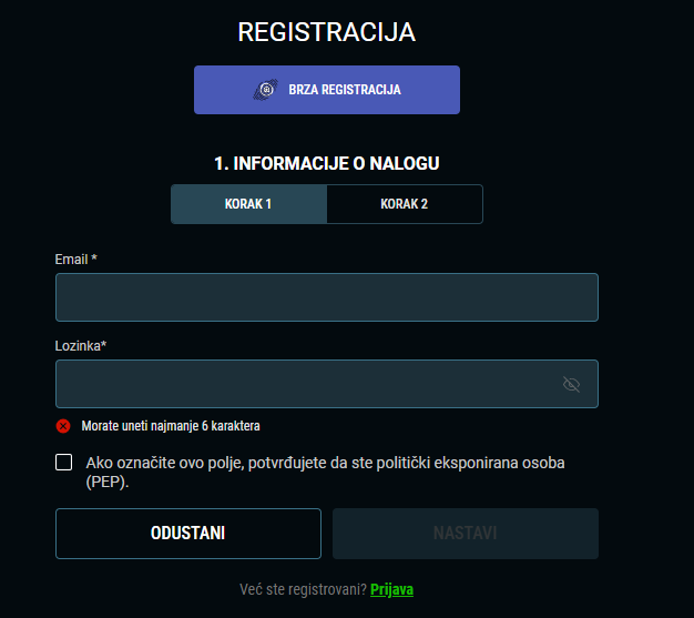 Ako želiš početi odmah, koristi opciju „BRZA registracija“.